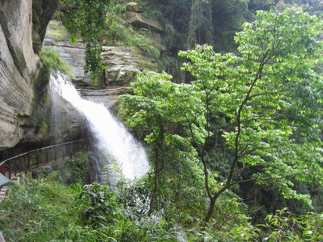 景點特色精簡說明:     休憩涼亭往龍宮瀑布棧橋已修復,龍宮瀑布現已開放。龍宮大瀑布從竹坑溪步道的下端29.6K處停車場出發,約五分鐘即可來到步道的入口,循步道前行,中途有一休憩涼亭,往左可見到雷音瀑布群,往右前方可見到龍宮大瀑布。